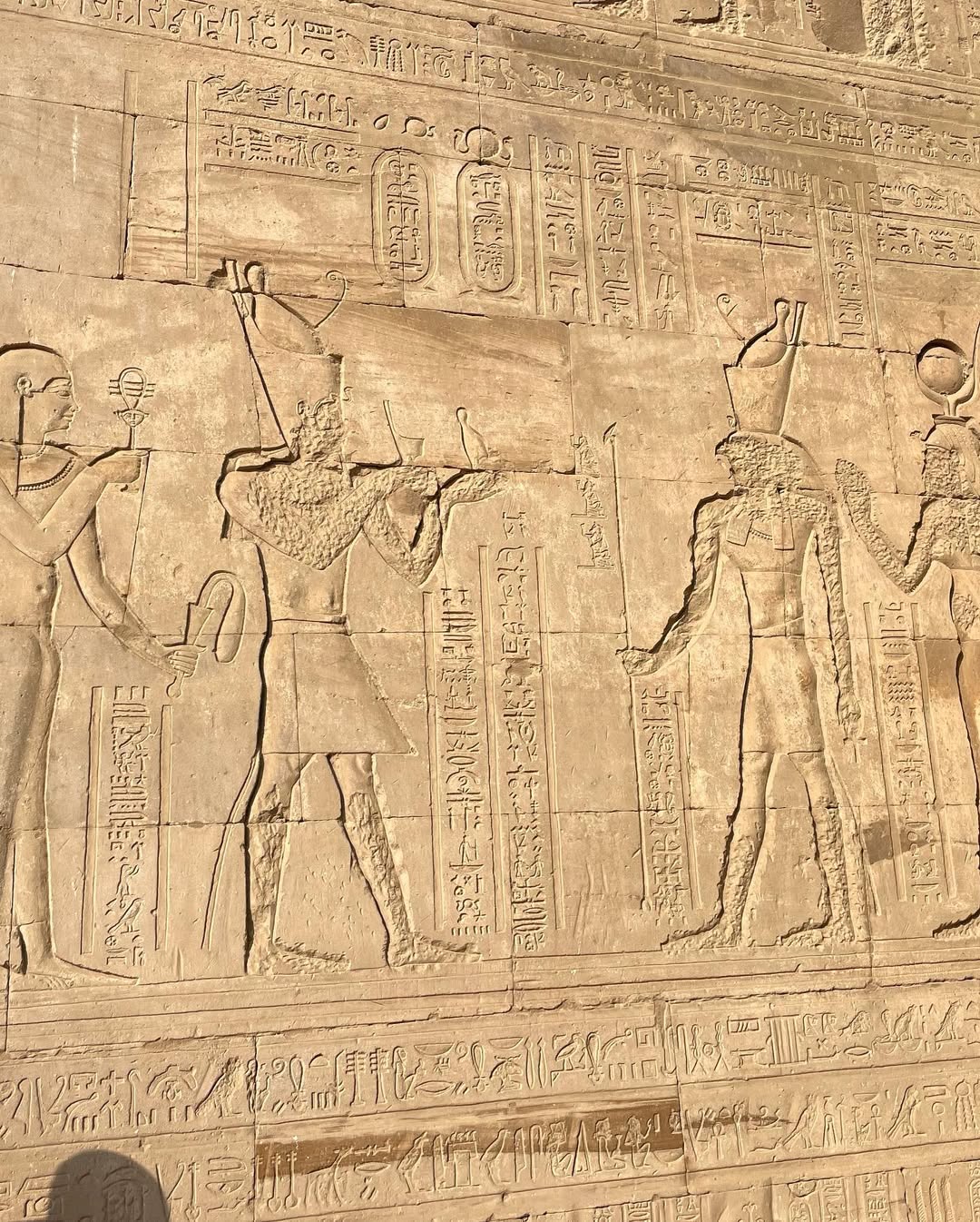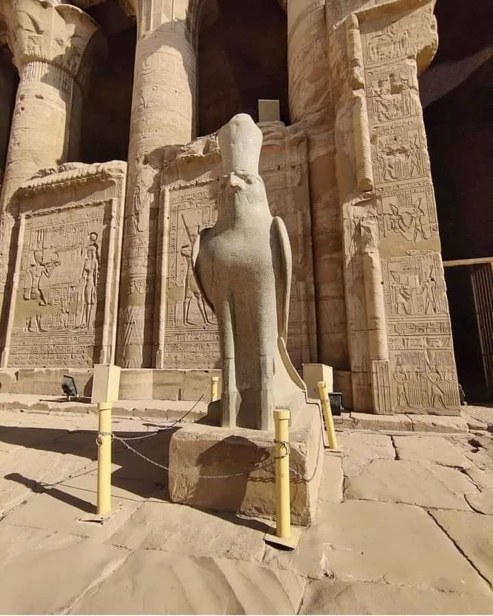 The temple stands as a testament to ancient Egyptian religious architecture, featuring a classic Ptolemaic design with a massive pylon entrance, a hypostyle hall, an offering hall, and a sanctuary where the sacred statue of Horus once resided. The walls are adorned with intricate hieroglyphic inscriptions and reliefs depicting mythological scenes, including the famous “Triumph of Horus” over Seth, symbolizing the victory of order over chaos.